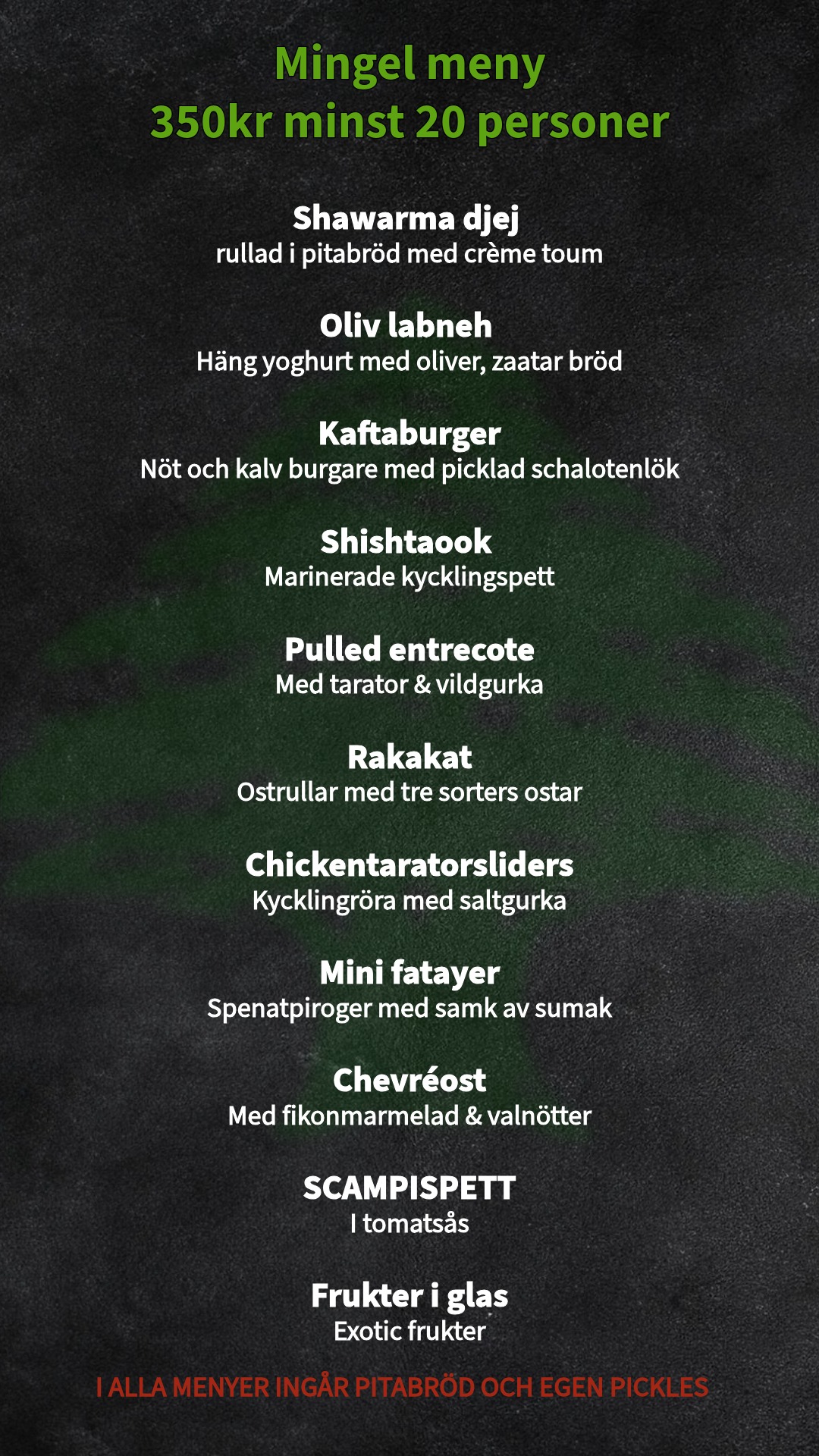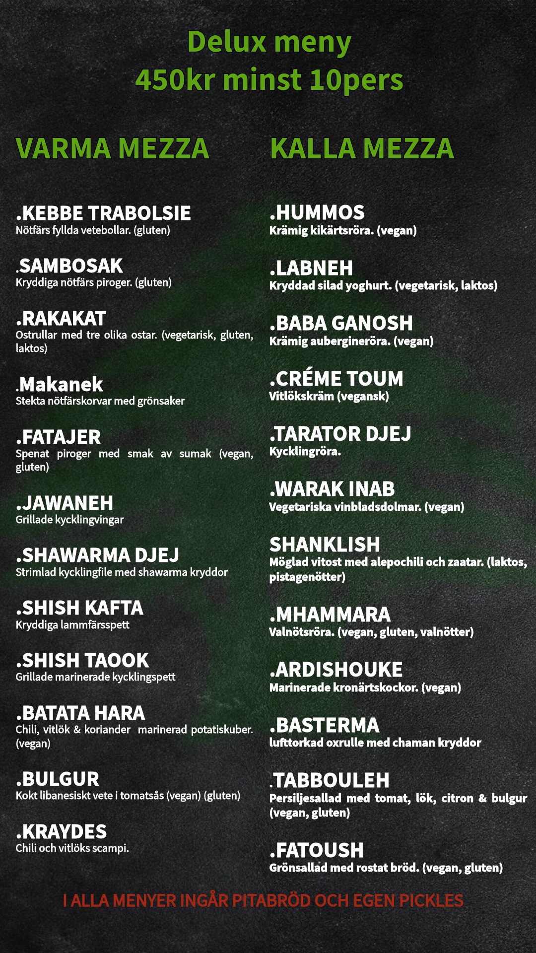 (om ej annat anges). All mat läggs upp på vår lyxiga guldiga engångsfat